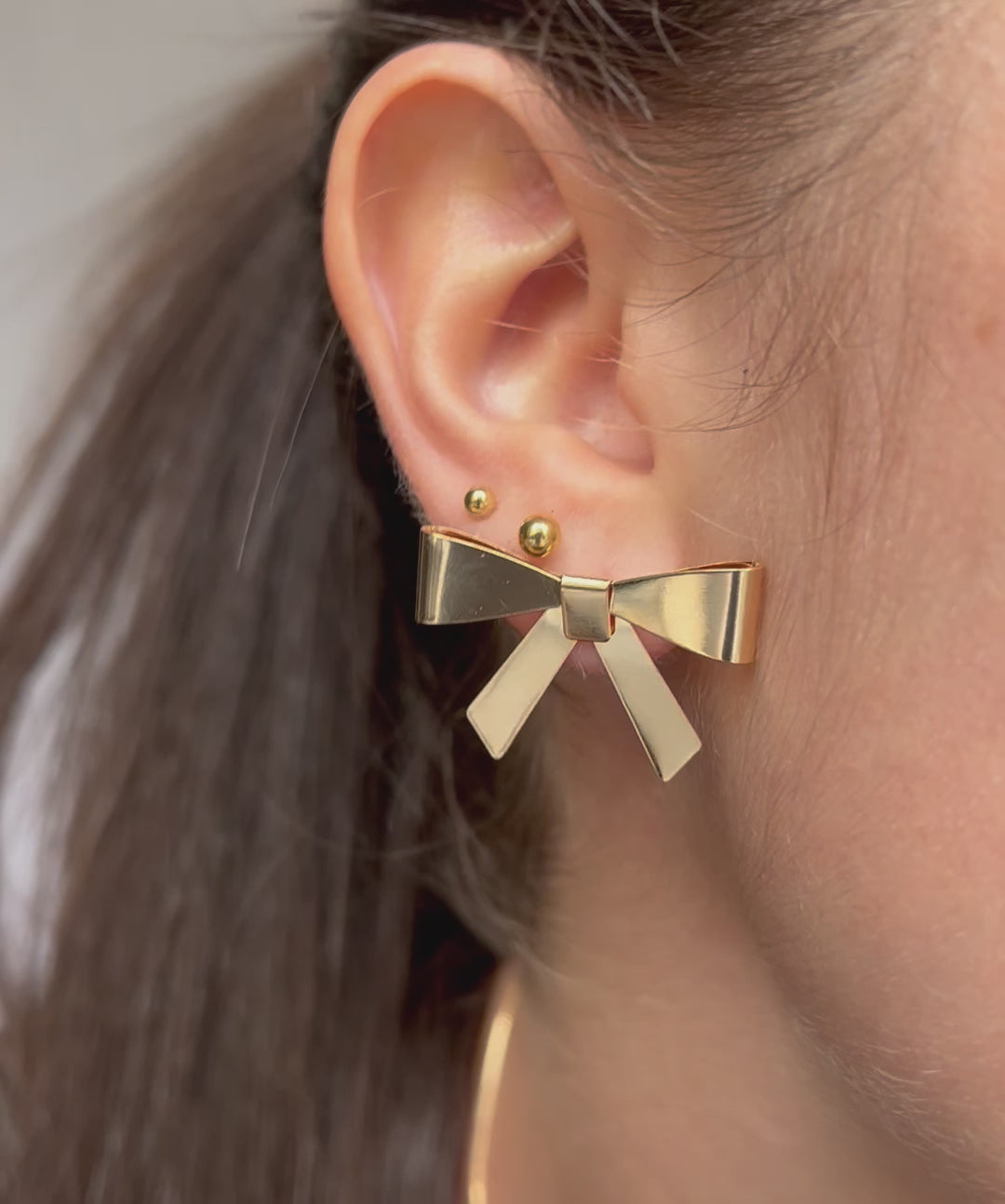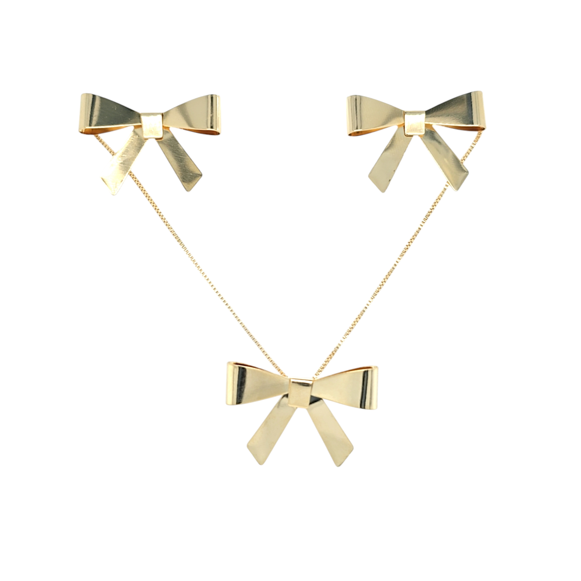Make a bold statement with this unique bow-inspired jewelry set. Designed to highlight your feminine charm, the sleek golden finish adds a modern edge to the timeless bow motif. Perfect for elevating both casual and formal looks, this set is a must-have for those who value elegance with a touch of individuality. 🤎