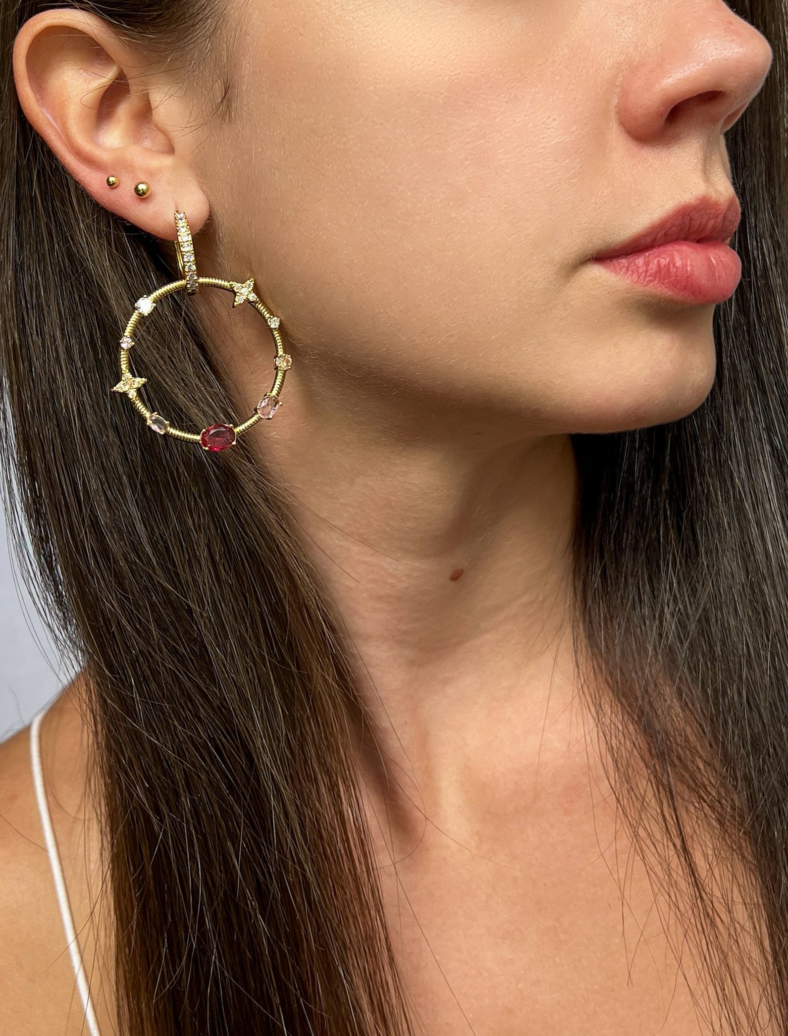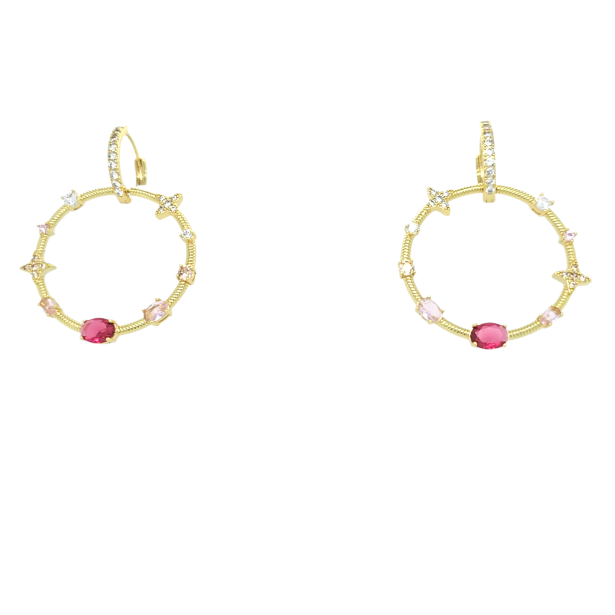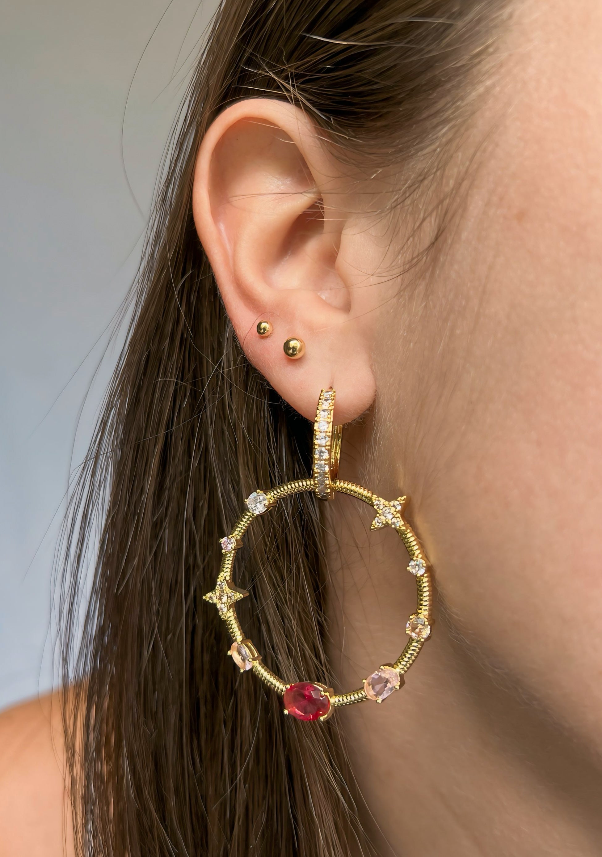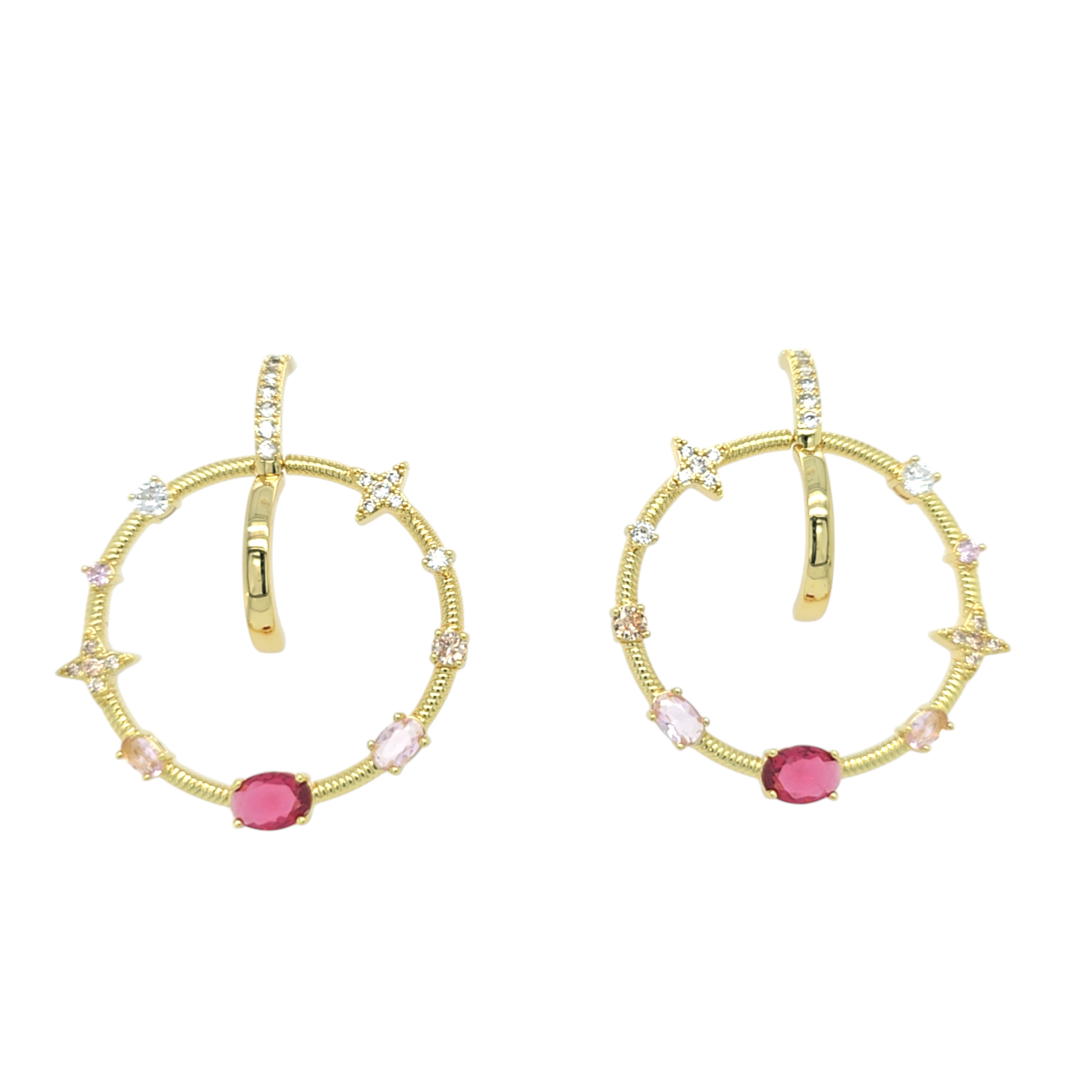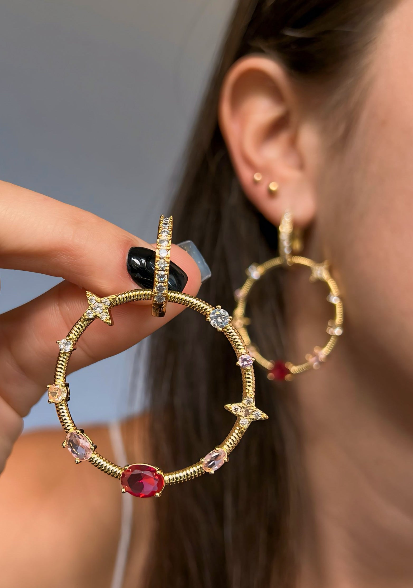 Grace your look with these dazzling hoop earrings, showcasing a celestial design enriched with sparkling stones and delicate star accents. The radiant gold finish and vibrant details create a perfect blend of elegance and charm, making them a standout accessory for any outfit. 🤎