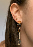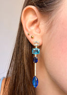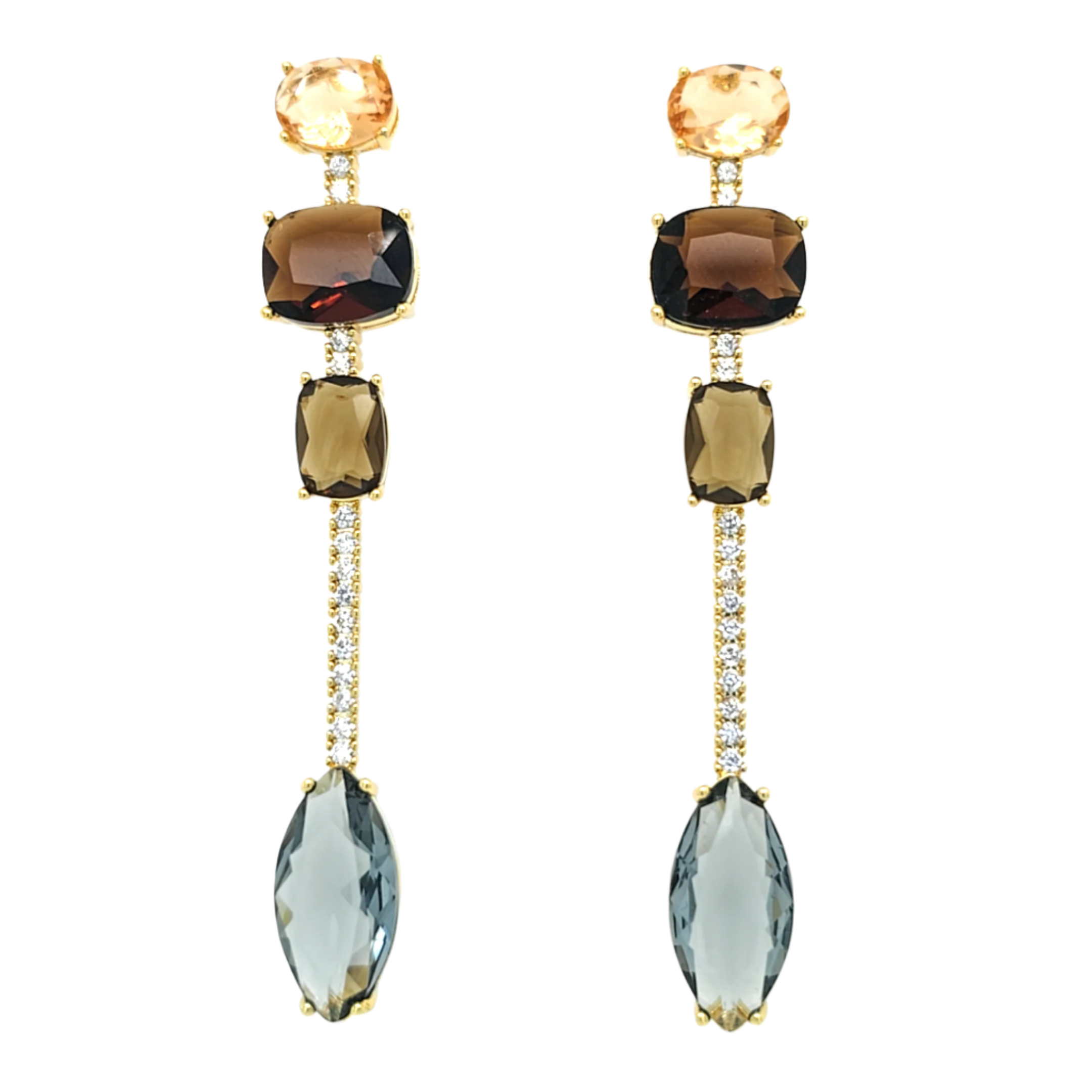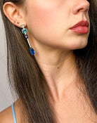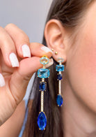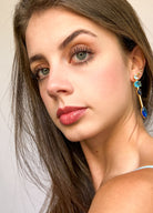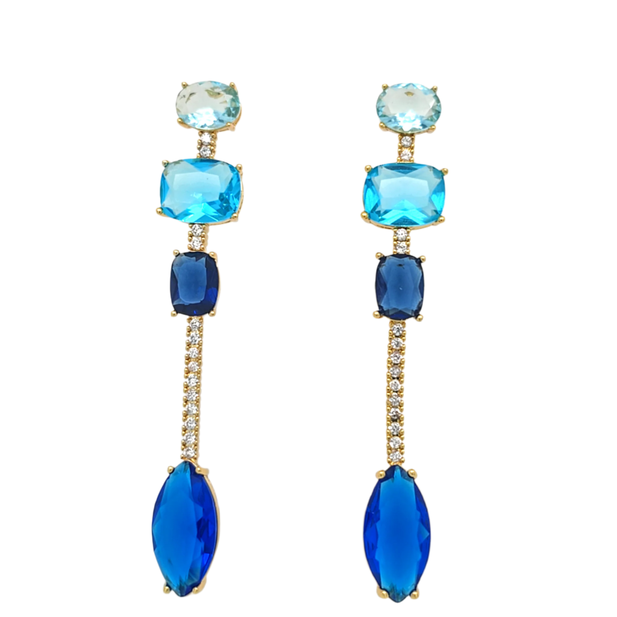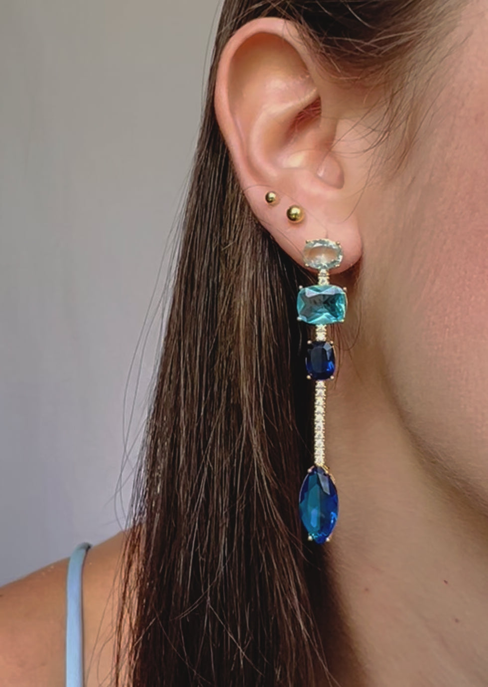 These exquisite earrings are available in two stunning color options: a rich brown chocolate or a vibrant blue gradient. The brown chocolate option offers a warm, earthy elegance, perfect for a subtle yet sophisticated look. The blue gradient version, with its aqua to deep sapphire hues, adds a bold, cool-toned flair that captures attention. Both choices feature a mix of gemstone shapes set along a crystal-lined bar, providing a luxurious touch to elevate any outfit. Choose the color that best complements your style—warm and chic or cool and captivating. 🤎