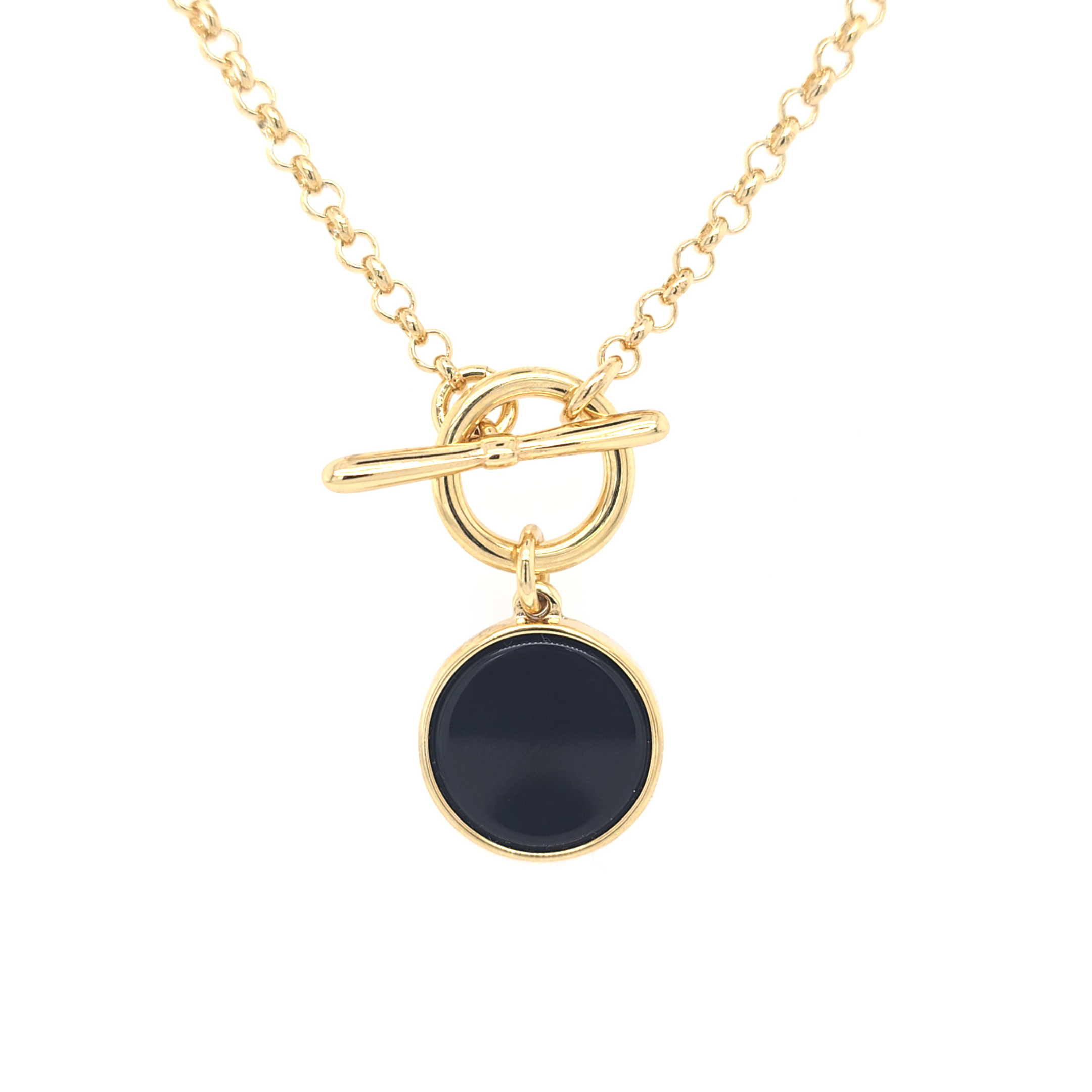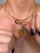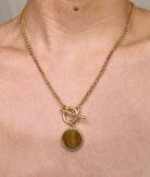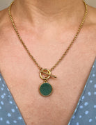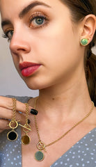 Complete your look with this stunning jewelry set, crafted in 18k gold-filled elegance and designed to capture attention. Featuring a chic necklace and matching stud earrings, each piece is adorned with a round gemstone that adds a sophisticated touch. Available in three distinct gemstone colors, this set allows you to express your unique style. The necklace features a toggle clasp, combining convenience with modern flair, while the earrings bring a subtle, timeless charm. Perfect for any occasion, this versatile set will quickly become a favorite addition to your jewelry collection. 🤎