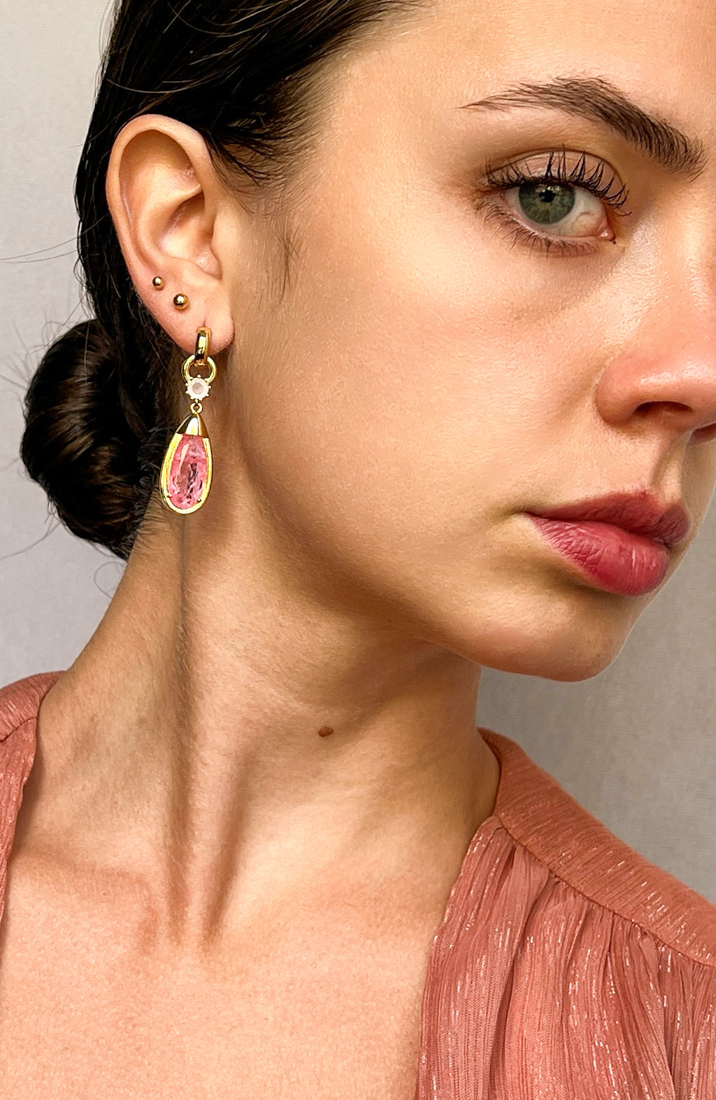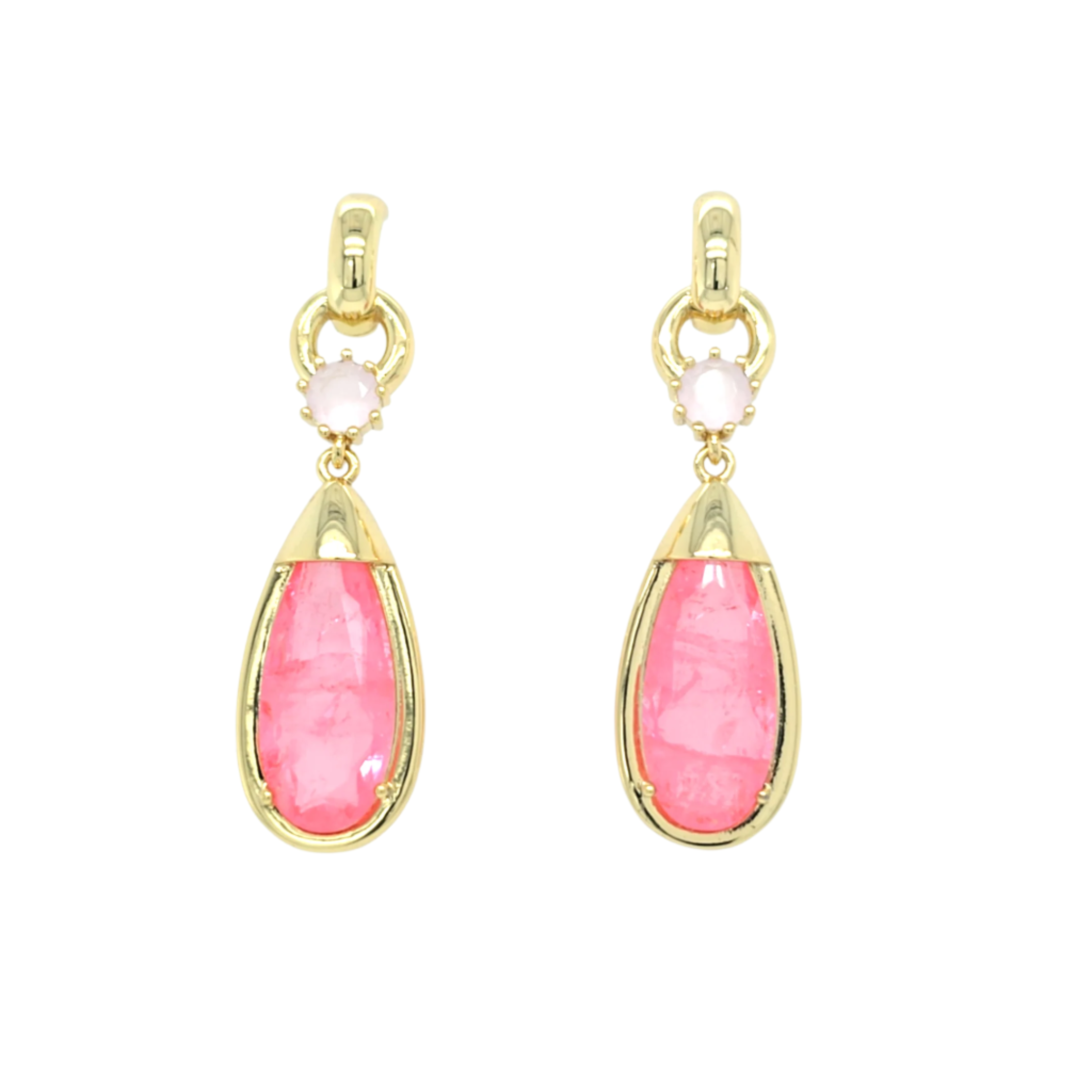 Elegant and bold, these drop earrings feature a captivating pink gemstone paired with a delicate round accent for a refined touch. Perfect for adding a pop of color and sophistication to your look, they are designed to complement any occasion with timeless charm. 🤎