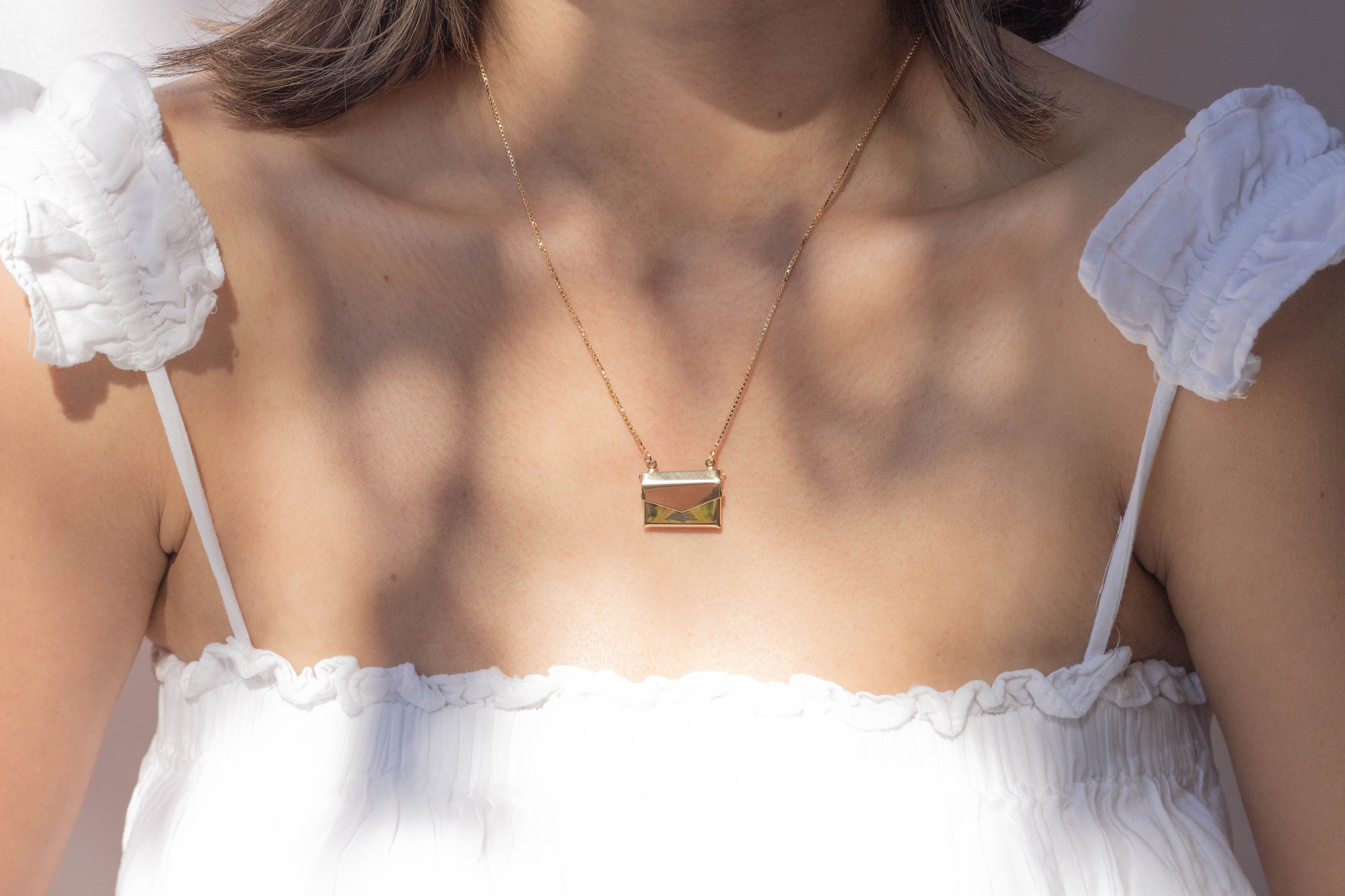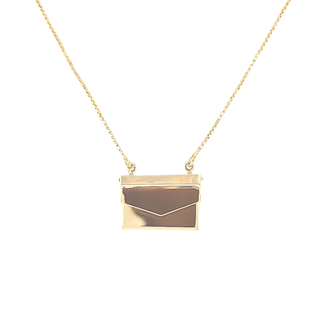 This necklace features a beautiful and shiny envelope design. Crafted with high-quality materials, it is sure to elevate any outfit. With its unique design, it is the perfect addition to any jewelry collection. 🤎
